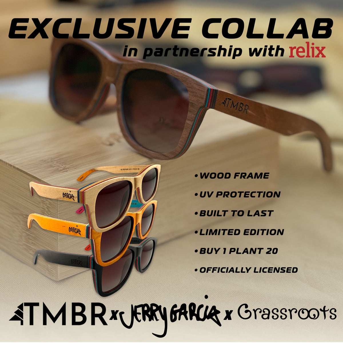 A special collaboration between TMBR, Grassroots California and Garcia Family Provisions; this limited-edition eyewear collection honors creativity, craftsmanship, and connection to the natural world. Each handcrafted wooden frame carries the marks of all three brands, a shared vision of artistry, sustainability, and legacy built to last.